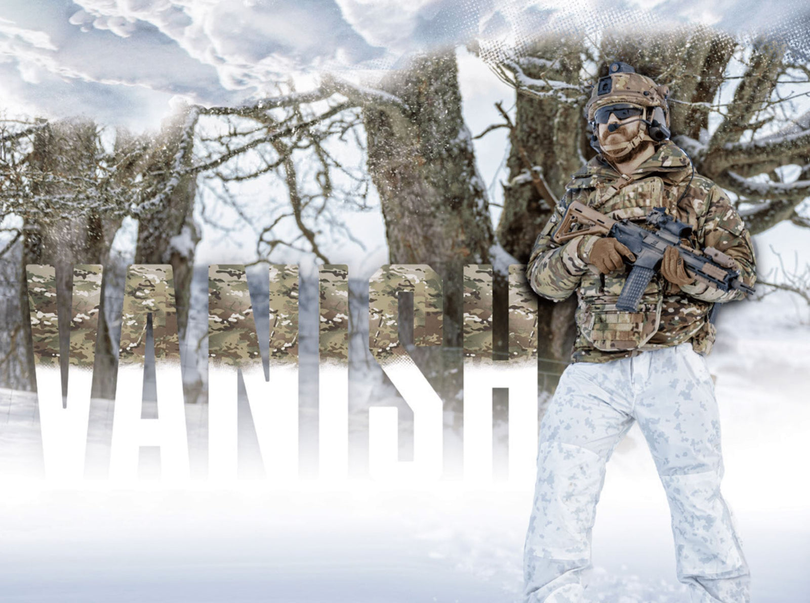 Designed to conceal in the harshest of environments this thin but durable non translucent outer material with a grey ghost camouflage pattern shields against all weather conditions without sticking & freezing to the inner layers due to our award-winning SDP (System Dual Protection).
