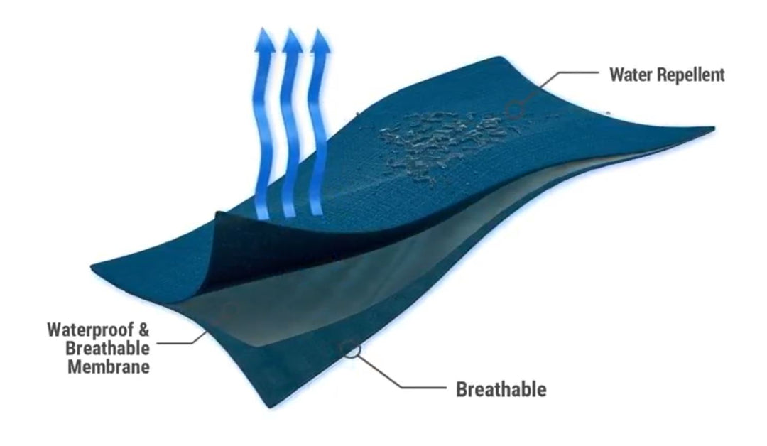 The outer woven stretch component is treated with a highly durable water repellent finish and then bonded to a hydrophilic membrane.
