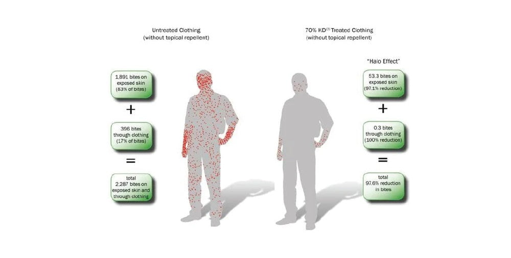 - No Need to Reapply – The active ingredient is bonded into the fabric, so it retains its effectiveness throughout the life of the garment (70 washes) and doesn’t need to be reapplied